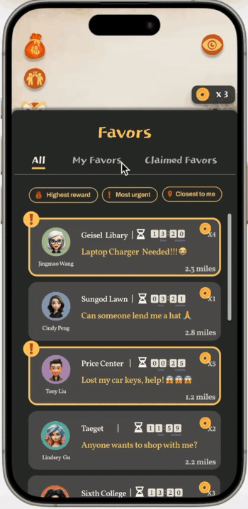 Share tasks you need help with for others to complete. Assign urgency, time, distance, and number of coins for rewards to your posted favors.