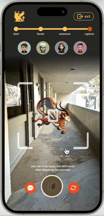 The key to finding the monster lies with the teammate who has unlocked the location clue. This clue is then shared in an announcement area for all teammates to see. As shown in the prototype on the left, team members will follow the AR foot steps of the monster as they unlock the rest of the location clues to find the final location of the monster. When they reach the final destination, they will see an AR summon circle indicating the place where the monster will appear after being summoned.
