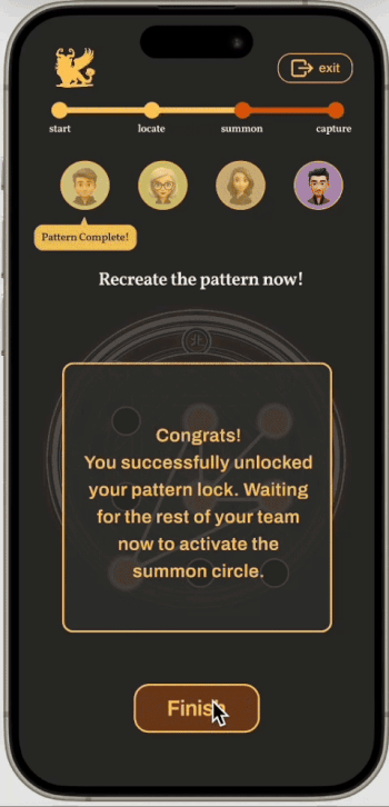 To successfully call forth the monster, each team member follows- on-screen instructions to unlock a unique pattern lock. This collective effort in both the digital and physical realms brings the monster from its hidden domain into our world, ready for the next phase of the adventure.