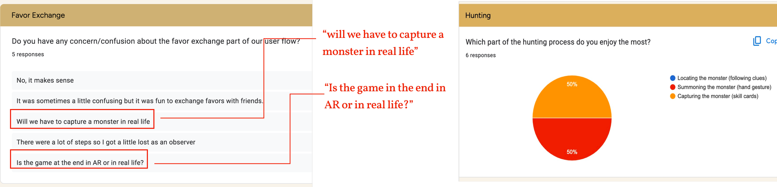 According to the survey responses, a few observing users are still confused about what activities are done physically versus on digital screens, which would be addressed by visualizing the entire gaming experience on a digital interface, particularly the representation of the AR monster in a camera view.