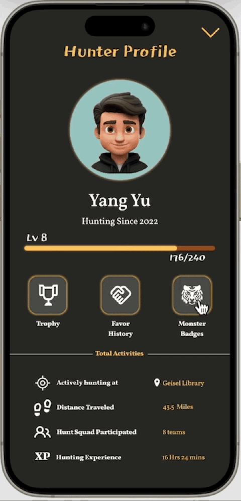 Areas of improvement include but are not limited to exploring additional flexibility in terms of providing users with the desired extent of freedom to choose their teams instead of solely relying on a systematic setup when forming hunting teams. Additionally, our team will make efforts to brainstorm, create, and develop a richer clue variety to enrich user experiences as they shop and unlock clues. In the future, we consider including more levels of clues that users can purchase such as "Gold Clues", "Silver Clues", and "Bronze Clues", and the more coins users have, the better clues they can buy to unlock more interesting ways to locate, summon, and capture monsters. Last but not least, our team will develop the UI an UX flows of the Filter Icon on the Home Map. When clicked upon, users can view their map in two filtered ways: