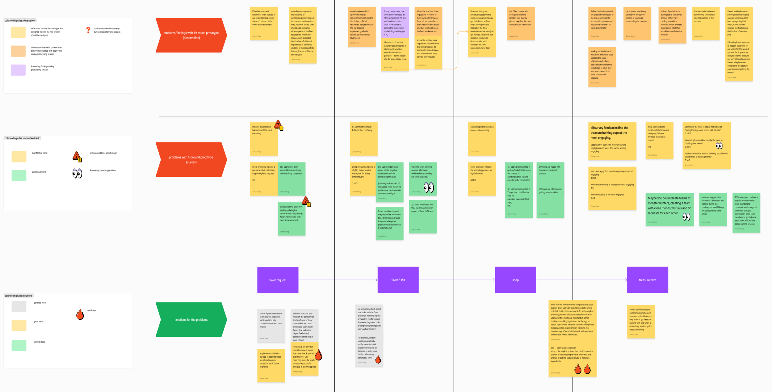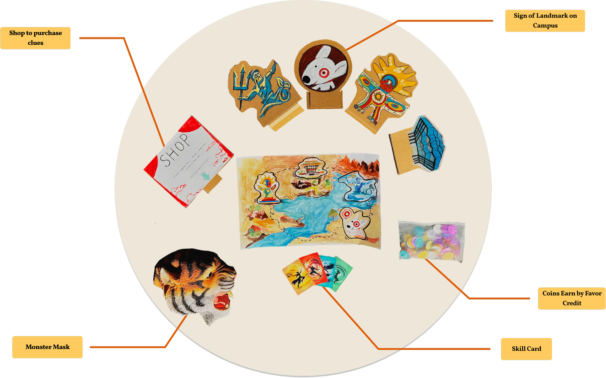 Everyone contributed in brainstorming the original Favor Treasure Hunt app, from all user flows to potential features as well as all gamification elements involved. As a team, we created all physical props including Map, Favor Request Forms, Location Marks, Clue Shop, Monster Mask, etc., and we participated in both 1.0 and 2.0 prototyping sessions.