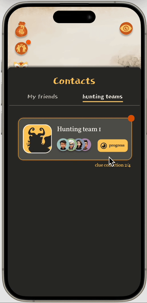As seen in the prototype on the right, users will see the real-time live status of their teams. If team members joined online, their profile will turn from gray dots to colorful profile images. When all profiles shown to be active, the hunting will then begin.