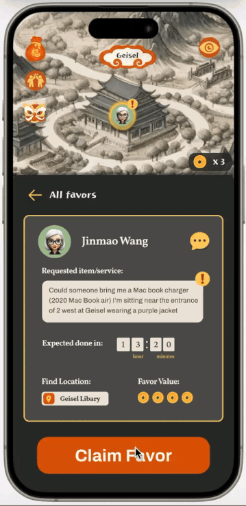 To document favor exchange and get points, users should first claim a favor request, prepare the requested item/service, and physically deliver the “favor order” to the friend who asks for it in the designated location. Once the favor is completed, both parties need to confirm the completion on individual UIs, through which the coins would transfer to favor doers’ account.